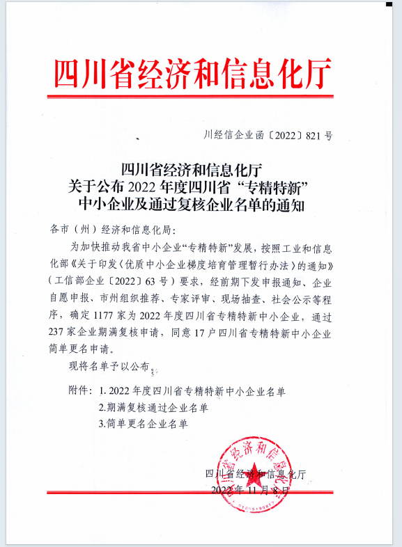 | 四川省經濟和信息化廳關于公布 2022年度四川省“專精特新中小企業及通過復核企業名單的通知 | ||